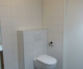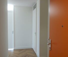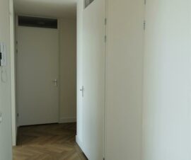 Entree appartement, ruime hal met garderobekast, berg-/waskast en een modern apart toilet met fontein.