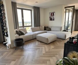 Vanuit de hal bereik je de zeer riante woonkamer met zijn gezellige vormen en prachtige visgraat PVC-vloer met een mooie plintafwerking. Wat direct opvalt zijn de vele raampartijen (kiep/kantel) met enorm veel lichtinval en waar je ook kijkt je hebt een prachtig uitzicht over de stad en de Utrechtse Heuvelrug