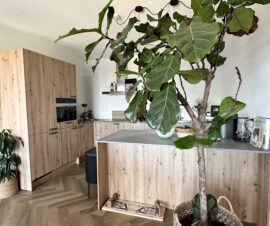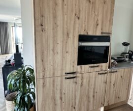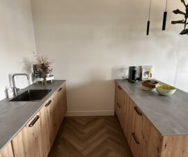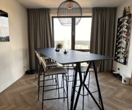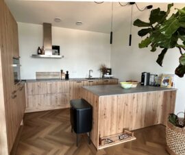 De halfopen keuken is uitgerust met een fraaie keuken met een werkeiland en alle wenselijke apparatuur zoals een inductie kookunit, afzuigkap, koelkast met vriesvakje, combimagnetron en vaatwasser. De brede lades hebben een praktische bestekindeling.