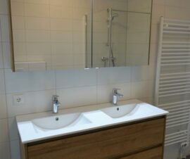 De riante, geheel betegelde badkamer is modern uitgerust met een mooi wastafelmeubel met een bovenkastje met spiegels en verlichting, vrij hangend toilet, douchecabine en een elektrische verwarming.