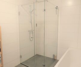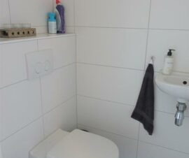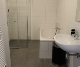 De badkamer is volledig betegeld. Hierbij is gebruik gemaakt van een grote wand- en vloertegel. Er is een ligbad en aparte douche met douchewand. Daarnaast is er een wastafel en designradiator aangebracht. Alle leidingen zijn keurig in de muur weggewerkt. Het toilet is separaat, voorzien van wandcloset en fontein.