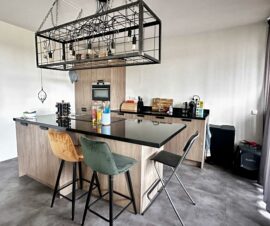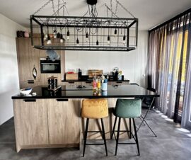 In het oog springt de moderne, strakke keuken. De warme houtlook kasten combineren fraai bij het natuurstenen, donkere werkblad. De opstelling, met een kookeiland, nodigt uit om gezellig aan te schuiven tijdens het koken om de dag te door te nemen. De apparatuur bestaat uit een inductiekookplaat met afzuigfunctie in de kookplaat zelf, een combi-oven, koelkast, vriezer en een vaatwasser.