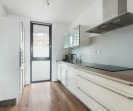 De open keuken sluit naadloos aan op de woonkamer, ideaal want zo hoef je tijdens het kokkerellen voortaan geen enkel gesprek meer te missen. Het geheel is geplaatst in een wandopstelling en voorzien van diverse kasten en lades waardoor je aan werk- en opbergruimte niets te kort zult komen. Vanuit de keuken heb je zicht op de fraai aangelegde gemeenschappelijke binnentuin aan de achterzijde van het complex, heerlijk!
