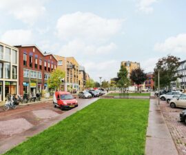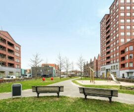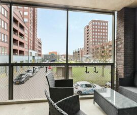 Via de schuifpui in de woonkamer kom je op het fijne balkon op het zuiden. Het balkon biedt ruimte genoeg om een comfortabel zitje neer te zetten waar je lekker van het zonnetje kunt genieten. Je kijkt hier vrij uit over de omgeving en het park met speeltuintje.