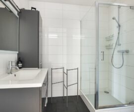 En dan de badkamer.. dé uitgelezen plek om na een dag werken even lekker te ontspannen. De ruimte is van grond tot plafond betegeld en heeft een verzorgde uitstraling. De indeling bestaat uit een inloopdouche en een wastafelmeubel.