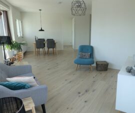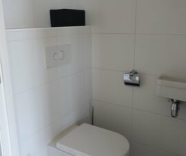 At the entrance, the beautiful floor that lies throughout the whole apartment, immediately stands out, the hall gives access to an indoor storage room with heating installation, a separate toilet with a fountain and the meter cabinet.