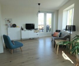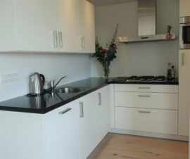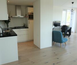 From the hall you come into the very light living room with its beautiful high windows that give a nice view over the city of Amersfoort and in terms of layout the entire apartment is very cozy. For example, there is a cozy atmosphere where indoor windows can open and the beautiful double windows from the ground make you believe that you can step out. At the living room is the semi-open kitchen with a cooking unit, hood, spacious fridge, dishwasher and a combi oven/microwave.