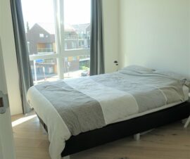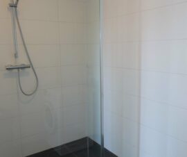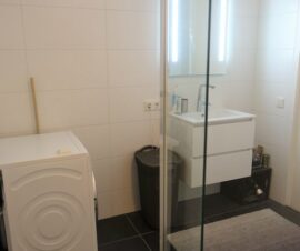De riante slaapkamer, met eveneens een raam vanaf de grond tot het plafond meet ca. 12m2. De geheel betegelde badkamer heeft een douche, wastafelmeubel en aansluiting voor de wasmachine.