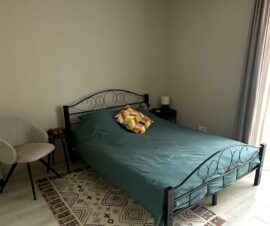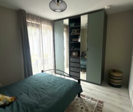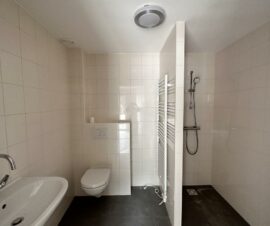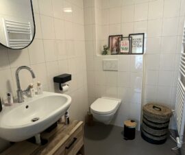 Vanuit de slaapkamer kom je in de geheel betegelde badkamer met een wastafel, inloopdouche, zwevend toilet, design radiator en wasmachineaansluiting. Ook de slaapkamer heeft een deur met toegang tot de tuin.