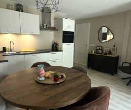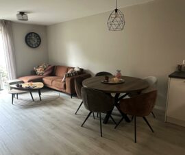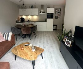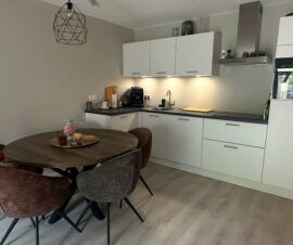 De woonkamer heeft een mooie laminaatvloer, prachtig geschilderde wanden. De nieuwe open keuken is in een moderne zwart/wit uitvoering en hoekopstelling met bovenkastjes. Alle gewenste inbouwapparatuur is aanwezig waaronder een inductiekookplaat, afzuigkap, koelkast met vriesvak en een vaatwasser.