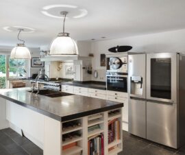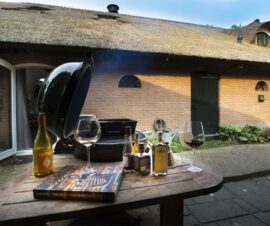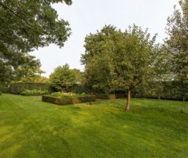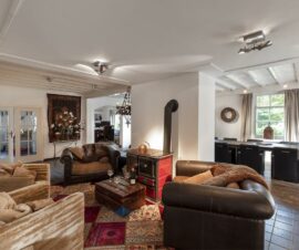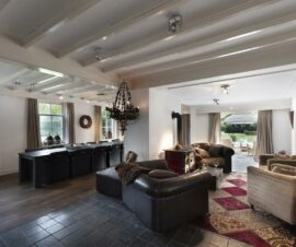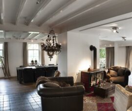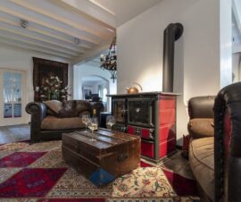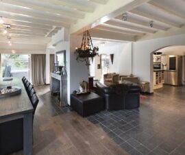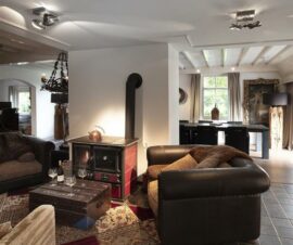 De moderne, landelijke woonkeuken is een echte eyecatcher. Uiteraard is deze ook van alle gemakken voorzien met een combi-oven, Lacanche 5-pits gasfornuis met 3 ovens, vaatwasmachine, koel-/vriescombinatie en Belgisch hardstenen blad. Hier kan echt worden gekookt!
