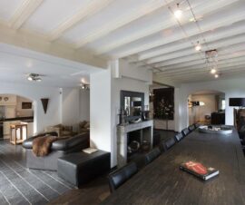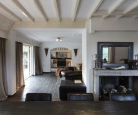 The huge kitchen/living room has been renovated in its own character and partly equipped with a Belgian bluestone floor and partly an oak floor. There is a beautiful antique fireplace (fireplace not working), and beamed ceiling.