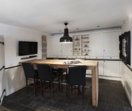 De enorme woonkeuken/woonkamer is in zijn eigen karakter verbouwd en gedeeltelijk voorzien van een Belgisch hardstenen vloer en gedeeltelijk een eiken vloer. Er is een prachtige antieke schouw (open haard niet werkend), en balkenplafond.